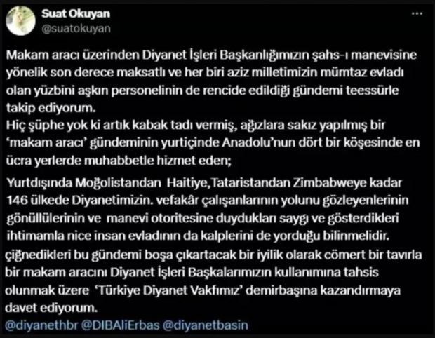 Tepkilerin gelmesine neden olan çağrının sebebi ise Diyanet İşleri Başkanlığı Müşaviri Suat Okuyan... Okuyan sosyal medya hesabından araç üzerinden yapılan tartışmaları hedef aldı ve iş adamlarına seslendi. Eleştirileri 'çirkin' olarak yorumlayan Okuyan iş adamlarına ve hayırseverlere seslenerek Ali Erbaş'a bir araç bağışında bulunmasını istedi.